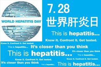 世界肝炎日为7月28日,第一届世界肝炎认知日宣传活动定于2004年10月1日在比利时布鲁塞尔举行,其主题是“与你同行(YouHaveCompany)”,主要目的是向公众、医务界、政府人员宣传有关丙型肝炎的预防、筛查和治疗知识。