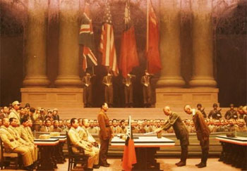 1945年9月2日,日本向盟军投降仪式在东京湾密苏里号军舰上举行。之后每年的9月3日,被确定为中国人民抗日战争胜利纪念日,也是世界反法西斯战争胜利纪念日。hH9汉语字典