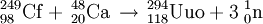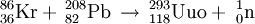 Berkeley实验室的V. Ninov等人于1999年发表了利用氪-86和铅-208通过1n道生成118号元素的实验结果[Nin99],但结果于2001年宣布收回,方程式如下: