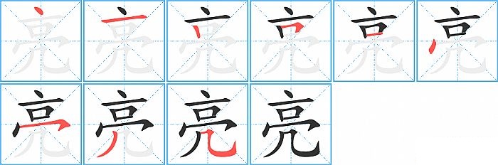亮是上下结构,亮的部首是“亠”,部外笔画7画,总笔画9画,亮的笔画顺序是“点、横、竖、横折、横、点、横撇/横钩、撇、横折弯钩/横斜钩”。看看“亮”字什么意思 >>