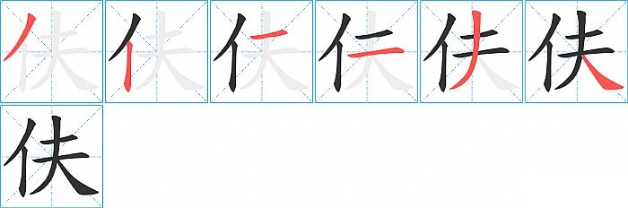伕是左右结构,伕的部首是“亻”,部外笔画4画,总笔画6画,伕的笔画顺序是“撇、竖、横、横、撇、捺”。