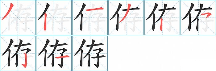 侟是左右结构,侟的部首是“亻”,部外笔画6画,总笔画8画,侟的笔画顺序是“撇、竖、横、撇、竖、横撇/横钩、竖钩、横”。