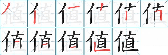 値是左右结构,値的部首是“亻”,部外笔画8画,总笔画10画,値的笔画顺序是“撇、竖、横、竖、竖、横折、横、横、横、竖折/竖弯”。看看“値”字什么意思 >>