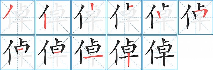 倬是左右结构,倬的部首是“亻”,部外笔画8画,总笔画10画,倬的笔画顺序是“撇、竖、竖、横、竖、横折、横、横、横、竖”。