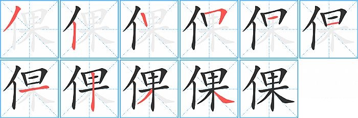 倮是左右结构,倮的部首是“亻”,部外笔画8画,总笔画10画,倮的笔画顺序是“撇、竖、竖、横折、横、横、横、竖、撇、捺”。