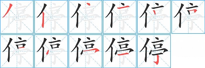 停是左右结构,停的部首是“亻”,部外笔画9画,总笔画11画,停的笔画顺序是“撇、竖、点、横、竖、横折、横、点、横撇/横钩、横、竖钩”。看看“停”字什么意思 >>
