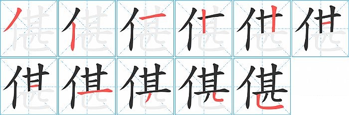偡是左右结构,偡的部首是“亻”,部外笔画9画,总笔画11画,偡的笔画顺序是“撇、竖、横、竖、竖、横、横、横、撇、点、竖折/竖弯”。看看“偡”字什么意思 >>