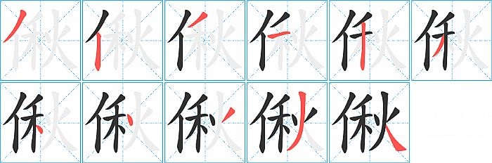 偢是左右结构,偢的部首是“亻”,部外笔画9画,总笔画11画,偢的笔画顺序是“撇、竖、撇、横、竖、撇、点、点、撇、撇、捺”。