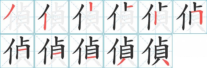 偵是左右结构,偵的部首是“亻”,部外笔画9画,总笔画11画,偵的笔画顺序是“撇、竖、竖、横、竖、横折、横、横、横、撇、点”。看看“偵”字什么意思 >>