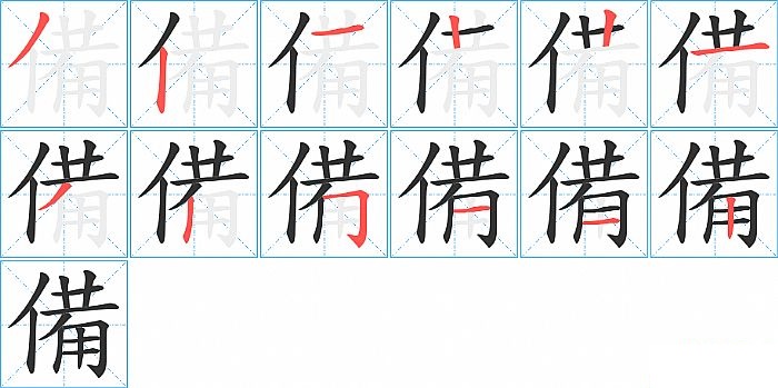 備是左右结构,備的部首是“亻”,部外笔画10画,总笔画12画,備的笔画顺序是“撇、竖、横、竖、竖、横、撇、竖、横折钩、横、横、竖”。看看“備”字什么意思 >>