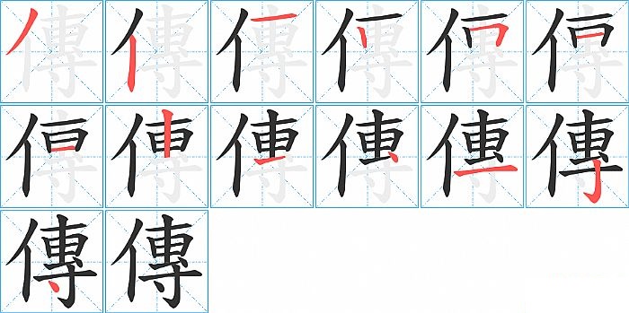 傳是左右结构,傳的部首是“亻”,部外笔画11画,总笔画13画,傳的笔画顺序是“撇、竖、横、竖、横折、横、横、竖、横、点、横、竖钩、点”。看看“傳”字什么意思 >>