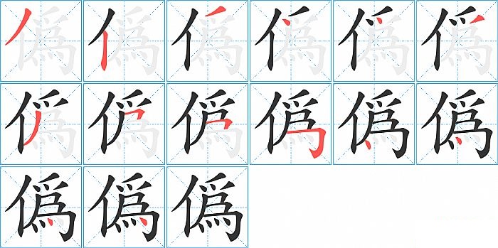 僞是左右结构,僞的部首是“亻”,部外笔画12画,总笔画14画,僞的笔画顺序是“撇、竖、撇、点、点、撇、撇、横折、横折、横折钩、点、点、点、点”。看看“僞”字什么意思 >>