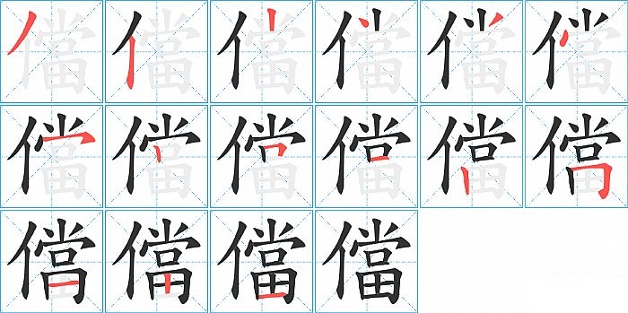 儅是左右结构,儅的部首是“亻”,部外笔画13画,总笔画15画,儅的笔画顺序是“撇、竖、竖、点、撇、点、横撇/横钩、竖、横折、横、竖、横折、横、竖、横”。看看“儅”字什么意思 >>