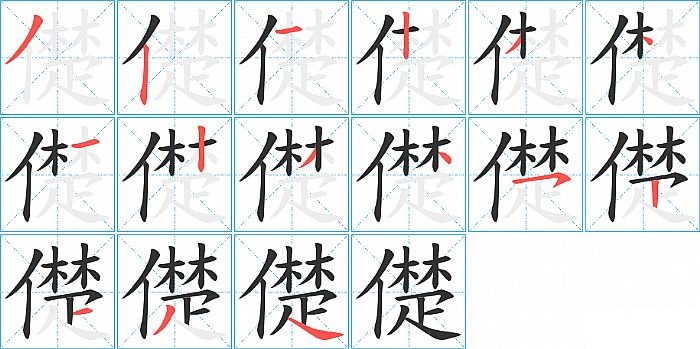 儊是左右结构,儊的部首是“亻”,部外笔画13画,总笔画15画,儊的笔画顺序是“撇、竖、横、竖、撇、点、横、竖、撇、点、横撇/横钩、竖、横、撇、捺”。看看“儊”字什么意思 >>