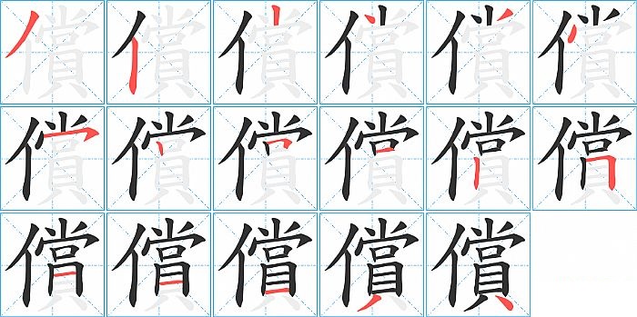 償是左右结构,償的部首是“亻”,部外笔画15画,总笔画17画,償的笔画顺序是“撇、竖、竖、点、撇、点、横撇/横钩、竖、横折、横、竖、横折、横、横、横、撇、点”。看看“償”字什么意思 >>