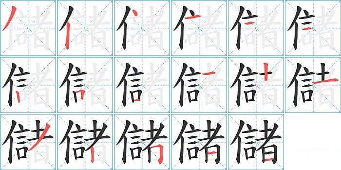 儲是左右结构,儲的部首是“亻”,部外笔画15画,总笔画17画,儲的笔画顺序是“撇、竖、点、横、横、横、竖、横折、横、横、竖、横、撇、竖、横折、横、横”。看看“儲”字什么意思 >>