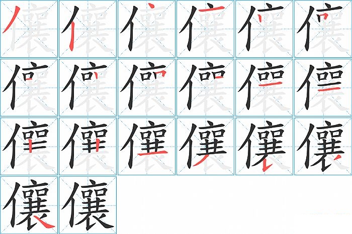 儴是左右结构,儴的部首是“亻”,部外笔画17画,总笔画19画,儴的笔画顺序是“撇、竖、点、横、竖、横折、横、竖、横折、横、横、横、竖、竖、横、撇、竖提、撇、捺”。看看“儴”字什么意思 >>
