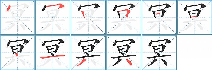 冥是上下结构,冥的部首是“冖”,部外笔画8画,总笔画10画,冥的笔画顺序是“点、横撇/横钩、竖、横折、横、横、点、横、撇、点”。看看“冥”字什么意思 >>