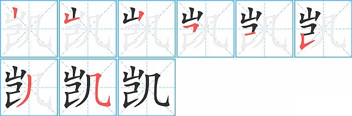 凯是左右结构,凯的部首是“几”,部外笔画6画,总笔画8画,凯的笔画顺序是“竖、竖折/竖弯、竖、横折、横、竖提、撇、横折弯钩/横斜钩”。看看“凯”字什么意思 >>