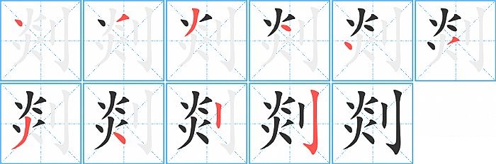 剡是左右结构,剡的部首是“刂”,部外笔画8画,总笔画10画,剡的笔画顺序是“点、撇、撇、点、点、撇、撇、点、竖、竖钩”。