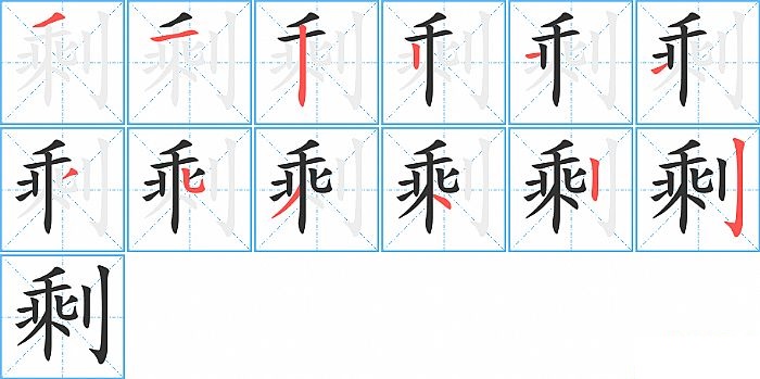 剩是左右结构,剩的部首是“刂”,部外笔画10画,总笔画12画,剩的笔画顺序是“撇、横、竖、竖、横、提、撇、竖弯钩、撇、点、竖、竖钩”。看看“剩”字什么意思 >>