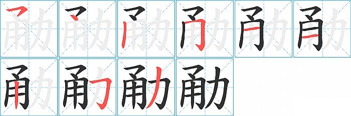 勈是左右结构,勈的部首是“力”,部外笔画7画,总笔画9画,勈的笔画顺序是“横撇/横钩、点、竖、横折钩、横、横、竖、横折钩、撇”。看看“勈”字什么意思 >>