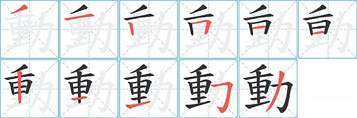 動是左右结构,動的部首是“力”,部外笔画9画,总笔画11画,動的笔画顺序是“撇、横、竖、横折、横、横、横、竖、提、横折钩、撇”。看看“動”字什么意思 >>