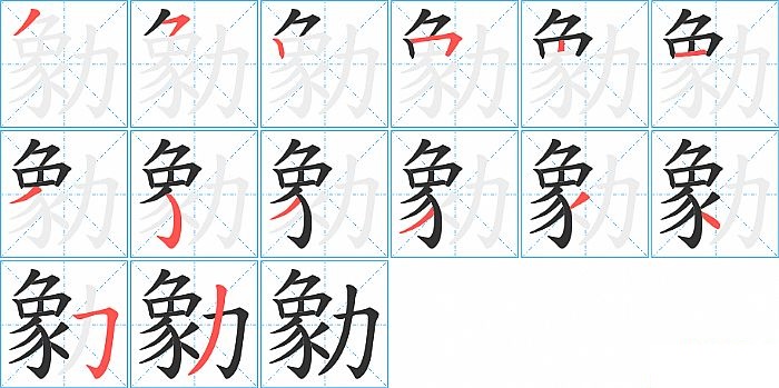 勨是左右结构,勨的部首是“力”,部外笔画11画,总笔画13画,勨的笔画顺序是“撇、横撇/横钩、竖、横折、横、撇、弯钩、撇、撇、撇、点、横折钩、撇”。看看“勨”字什么意思 >>
