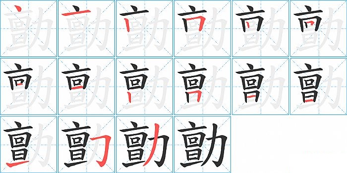 勯是左右结构,勯的部首是“力”,部外笔画13画,总笔画15画,勯的笔画顺序是“点、横、竖、横折、竖、横折、横、横、竖、横折、横、横、提、横折钩、撇”。看看“勯”字什么意思 >>