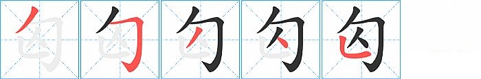 匃是右上包围结构,匃的部首是“勹”,部外笔画3画,总笔画5画,匃的笔画顺序是“撇、横折钩、撇、点、竖折/竖弯”。