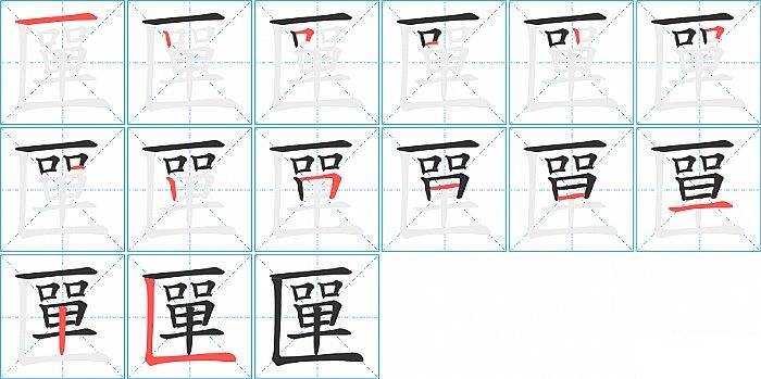 匰是左包围结构,匰的部首是“匚”,部外笔画12画,总笔画14画,匰的笔画顺序是“横、竖、横折、横、竖、横折、横、竖、横折、横、横、横、竖、竖折/竖弯”。看看“匰”字什么意思 >>