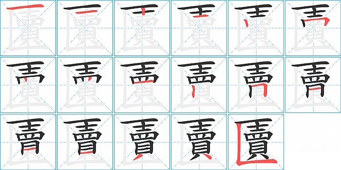 匵是左包围结构,匵的部首是“匚”,部外笔画15画,总笔画17画,匵的笔画顺序是“横、横、竖、横、竖、横折、竖、竖、横、竖、横折、横、横、横、撇、点、竖折/竖弯”。看看“匵”字什么意思 >>