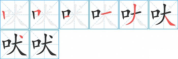 吠是左右结构,吠的部首是“口”,部外笔画4画,总笔画7画,吠的笔画顺序是“竖、横折、横、横、撇、捺、点”。