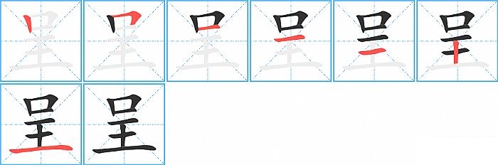 呈是上下结构,呈的部首是“口”,部外笔画4画,总笔画7画,呈的笔画顺序是“竖、横折、横、横、横、竖、横”。