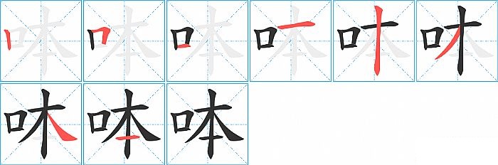 呠是左右结构,呠的部首是“口”,部外笔画5画,总笔画8画,呠的笔画顺序是“竖、横折、横、横、竖、撇、捺、横”。