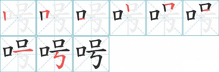 呺是左右结构,呺的部首是“口”,部外笔画5画,总笔画8画,呺的笔画顺序是“竖、横折、横、竖、横折、横、横、竖折折钩”。