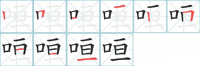 咺是左右结构,咺的部首是“口”,部外笔画6画,总笔画9画,咺的笔画顺序是“竖、横折、横、横、竖、横折、横、横、横”。