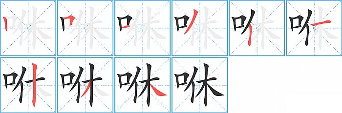 咻是左右结构,咻的部首是“口”,部外笔画6画,总笔画9画,咻的笔画顺序是“竖、横折、横、撇、竖、横、竖、撇、捺”。