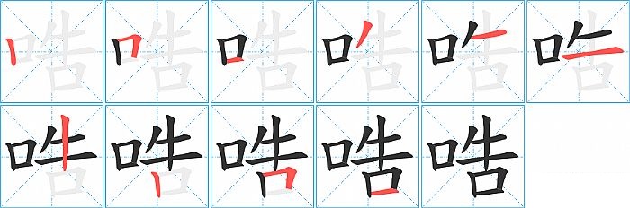 哠是左右结构,哠的部首是“口”,部外笔画7画,总笔画10画,哠的笔画顺序是“竖、横折、横、撇、横、竖、横、竖、横折、横”。
