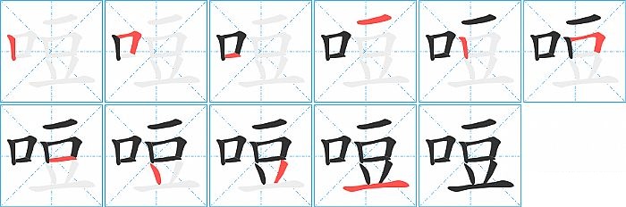 哣是左右结构,哣的部首是“口”,部外笔画7画,总笔画10画,哣的笔画顺序是“竖、横折、横、横、竖、横折、横、点、撇、横”。