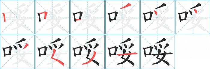 哸是左右结构,哸的部首是“口”,部外笔画7画,总笔画10画,哸的笔画顺序是“竖、横折、横、撇、点、点、撇、撇点、撇、横”。