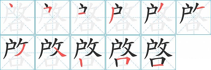 啓是上下结构,啓的部首是“口”,部外笔画8画,总笔画11画,啓的笔画顺序是“点、横折、横、撇、撇、横、撇、捺、竖、横折、横”。看看“啓”字什么意思 >>