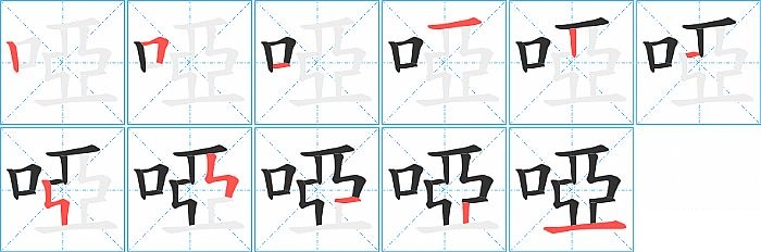 啞是左右结构,啞的部首是“口”,部外笔画8画,总笔画11画,啞的笔画顺序是“竖、横折、横、横、竖、横、竖折撇/竖折折、竖折撇/竖折折、横、竖、横”。看看“啞”字什么意思 >>