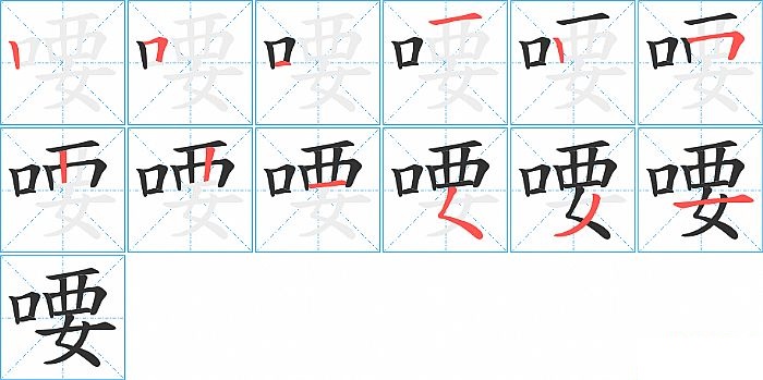 喓是左右结构,喓的部首是“口”,部外笔画9画,总笔画12画,喓的笔画顺序是“竖、横折、横、横、竖、横折、竖、竖、横、撇点、撇、横”。看看“喓”字什么意思 >>