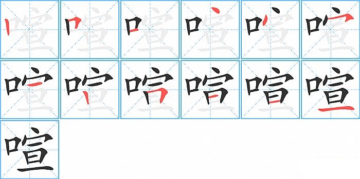 喧是左右结构,喧的部首是“口”,部外笔画9画,总笔画12画,喧的笔画顺序是“竖、横折、横、点、点、横撇/横钩、横、竖、横折、横、横、横”。看看“喧”字什么意思 >>