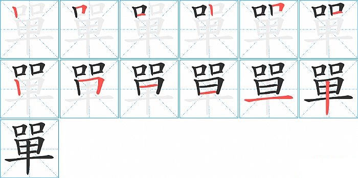 單是上下结构,單的部首是“口”,部外笔画9画,总笔画12画,單的笔画顺序是“竖、横折、横、竖、横折、横、竖、横折、横、横、横、竖”。看看“單”字什么意思 >>