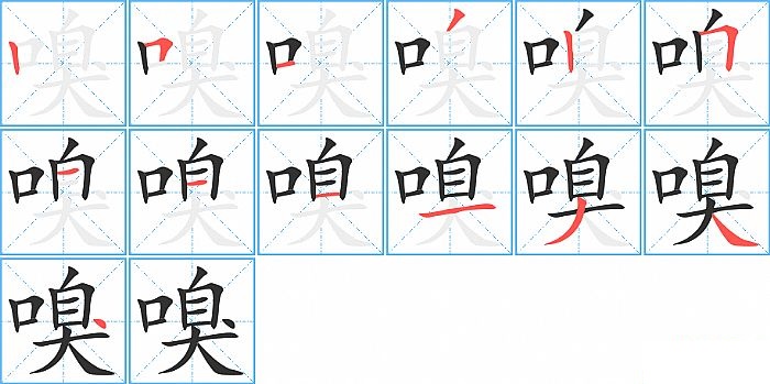 嗅是左右结构,嗅的部首是“口”,部外笔画10画,总笔画13画,嗅的笔画顺序是“竖、横折、横、撇、竖、横折、横、横、横、横、撇、捺、点”。看看“嗅”字什么意思 >>