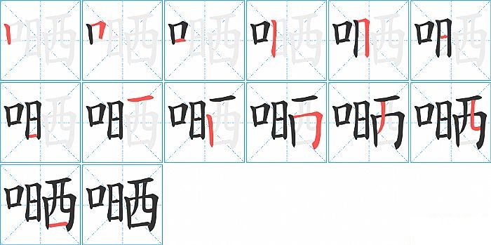 嗮是左右结构,嗮的部首是“口”,部外笔画10画,总笔画13画,嗮的笔画顺序是“竖、横折、横、竖、横折、横、横、横、竖、横折、撇、竖折/竖弯、横”。看看“嗮”字什么意思 >>