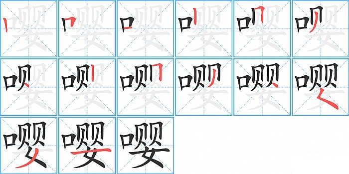 嘤是左右结构,嘤的部首是“口”,部外笔画11画,总笔画14画,嘤的笔画顺序是“竖、横折、横、竖、横折、撇、点、竖、横折、撇、点、撇点、撇、横”。看看“嘤”字什么意思 >>