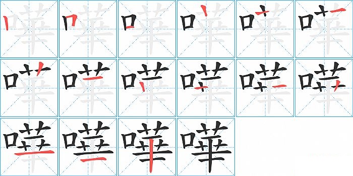 嘩是左右结构,嘩的部首是“口”,部外笔画10画,总笔画13画,嘩的笔画顺序是“竖、横折、横、横、竖、竖、横、横、竖、竖、横、横、竖”。看看“嘩”字什么意思 >>